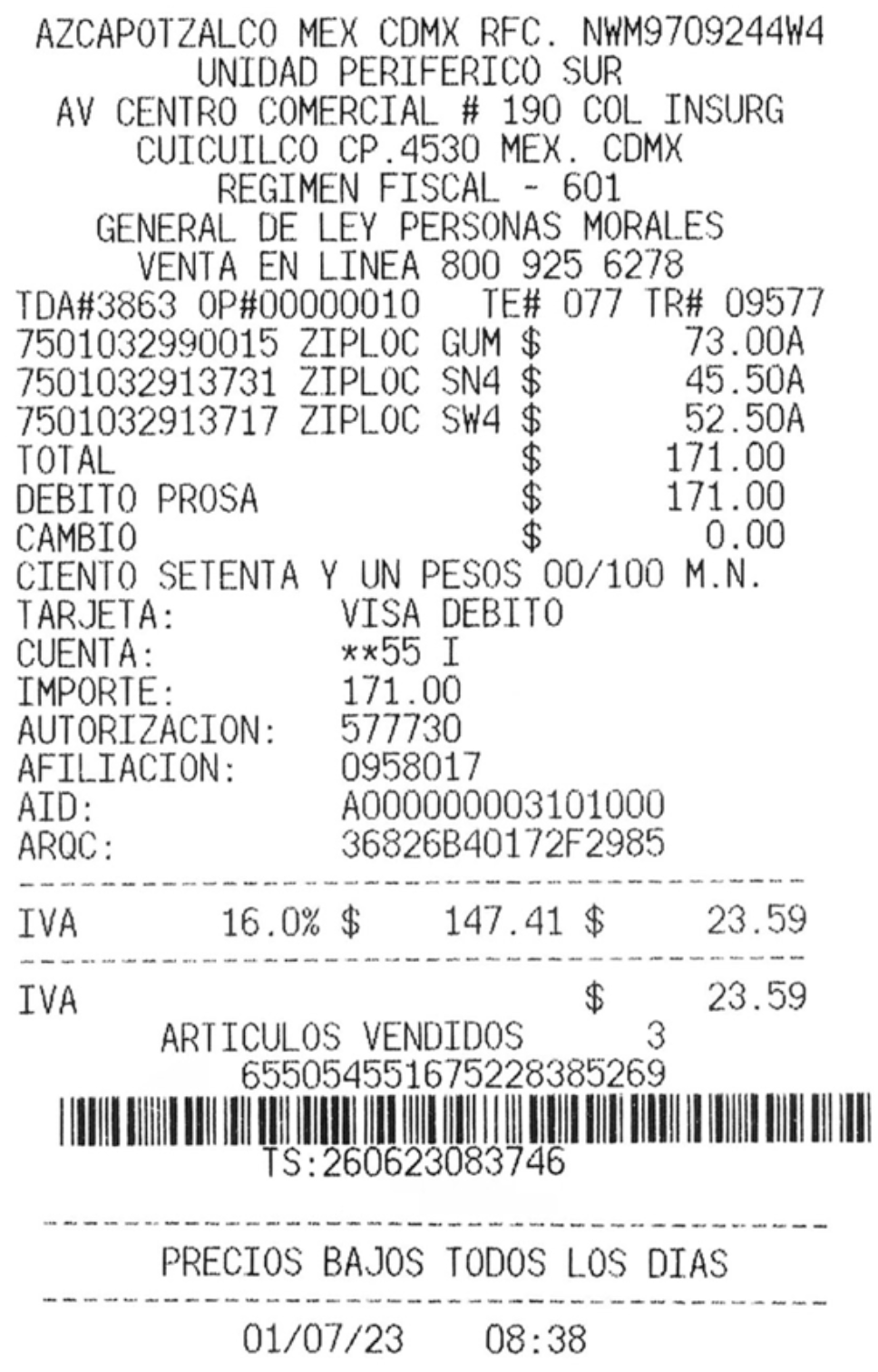 Se acompaña a continuación, para efectos meramente ilustrativos, la imagen de un ejemplo de ticket de compra que cumple con los requisitos antes mencionados: